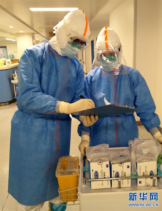 劉光耀(左)、喬冰在武漢同濟(jì)醫(yī)院中法新城院區(qū)做工作前的準(zhǔn)備(資料照片)。新華社記者 李安 攝