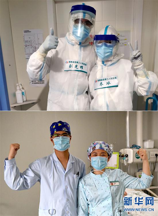 這是一張拼版照片:上圖為:劉光耀(左)和喬冰在武漢同濟(jì)醫(yī)院中法新城院區(qū)穿好防護(hù)服準(zhǔn)備進(jìn)入病區(qū)(資料照片,新華社發(fā));下圖為:2020年4月26日,劉光耀(左)和喬冰在河南省直第三人民醫(yī)院急重癥醫(yī)學(xué)中心病房?jī)?nèi)(新華社記者李安攝)。新華社記者 李安 攝