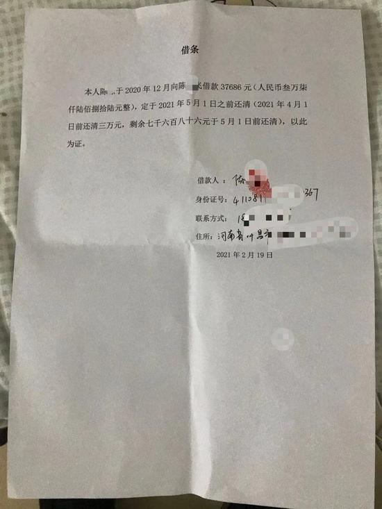 陳飛2月19日再次趕來鄭州。這次,他從娜娜手里拿到1000元錢,兩人立了借條,娜娜在借條中承諾會在4月1日前還清三萬元,余下7686元于5月1日還清。