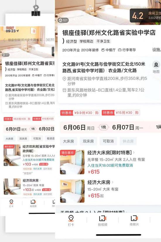 在鄭州回民六中考點附近,離學校50米的一家酒店,早早就顯示高考當天無房。記者來到酒店前臺,發(fā)現高考當天房間只能在前臺交付房費才能預定。原價一百多元的房間,在高考當天變?yōu)?98-998區(qū)間。同樣的情況,在鄭州九中和省實驗中學考點附近酒店也普遍存在:“雙床的經濟的是799,一張床600多,兩張床的700多都是便宜的,目前預定了三四十間。但是標間不多了,兩張床的不多了剩的全都是大床了。這個價格在去年已經定了價格不會變動。”