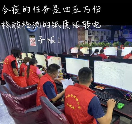 網友“心靜”在社交平臺發布了一則志愿者在中牟一家電競館連夜登記信息的視頻,視頻中大家身穿紅色馬甲,都在專心的對著電腦工作。隨后記者采訪了其中的一名志愿者,這名志愿者介紹,在8月2日,轄區開始進行核酸檢測,在一所小學設置了檢測點,這些志愿者都是來自這所學校的教師。“我當時從晚上11點工作到次日早上6點,我們能幫忙的只有在現場維持紀律和填寫信息,當時系統癱瘓了,我們開始手動登記,隨后再把紙質版的登記信息輸入成電子版?!边@位志愿者介紹,為了更方便快捷,街道辦事處領導臨時租下了這個電競館,大家開始工作。