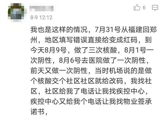 無獨有偶,網友“PGGA14”爆料,7月31日他從福建回鄭州,地區填寫錯誤直接變成了紅碼,目前已經做了三次核酸,聯系了新鄭機場、鄭州市疾控中心、所在社區等方,問題仍然沒有解決,只能在家進行隔離。