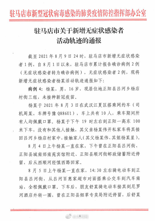 截至2021年8月9日24時,駐馬店市新增無癥狀感染者1例,自8月1日以來,駐馬店市累計報告確診病例2例(無癥狀感染者轉(zhuǎn)為確診病例),無癥狀感染者2例,現(xiàn)將新增無癥狀感染者楊某活動軌跡通報如下: