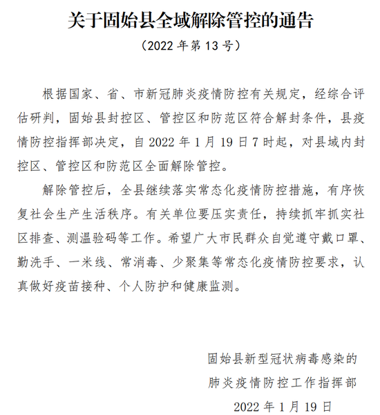 原標題:《固始縣發布第13號通告:全域解除管控》