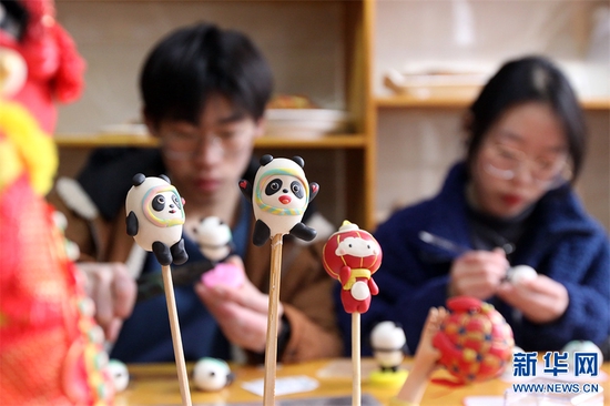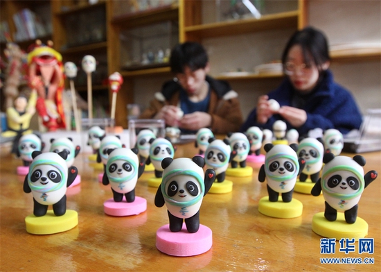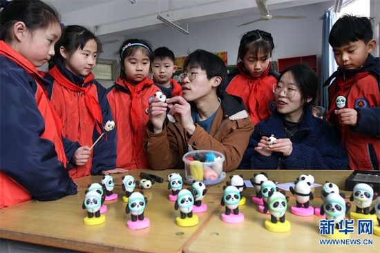 2月17日,河南省焦作市博愛縣秀珠小學,博愛縣“清化面塑”傳承人孫倩文、孫寶林為學生們講解面塑“冰墩墩”的制作工藝。