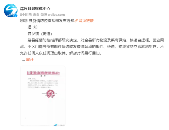 各鄉鎮(街道):經沈丘縣疫情防控指揮部研究決定,對全縣所有物流及菜鳥驛站、快遞自提柜、營業網點、小區門崗等所有郵件快遞收發接收站點的郵件、快遞、物流貨物立即就地封存,不允許任何人以任何理由取件。解封時間另行通知。