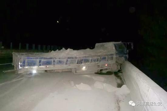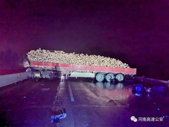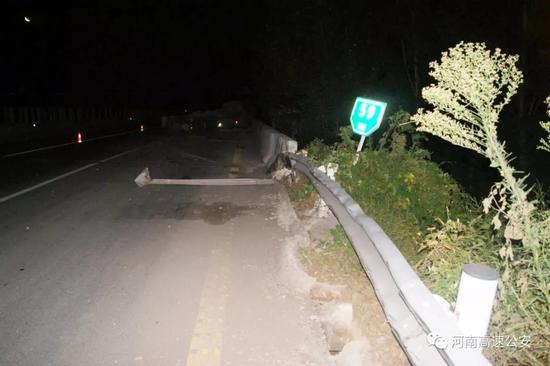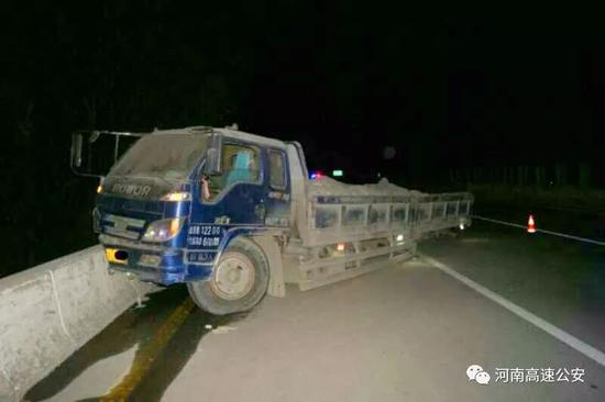 當日凌晨0時30分,安陽高速交警支隊二大隊接到報警:南林高速內黃段一輛重型貨車撞到橋墩上。二大隊民警韓瀟、尚飛立帶領3名輔警立即趕赴事故現場,在南林高速59公里處衛河橋頭上發現事故車輛,橋頭護攔板被撞掉一塊,損壞10多米長,該車后邊4個驅動輪掉到一邊,右前方向輪也幾乎撞掉,事故車輛差點掉進橋下河里。現場民警迅速布置警戒區域,聯系救援車輛和人員清理事故現場,盡快恢復交通。
