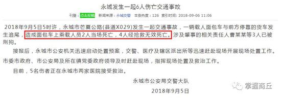2018年9月5日5時(shí)許,永城市芒夏公路(縣道X029)發(fā)生一起交通事故,一輛載人面包車與前方停靠的貨車發(fā)生追尾,造成面包車上乘載人員2人當(dāng)場(chǎng)死亡,4人經(jīng)搶救無(wú)效死亡。涉及肇事的相關(guān)責(zé)任人曹某某等3人已被刑拘。