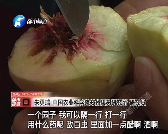 為了查清桃子究竟怎么回事兒,都市記者現(xiàn)摘了幾個桃子,請果農(nóng)專家看了看。鄭州果樹研究所研究員朱更瑞表示,蜜桃內(nèi)的蟲子叫桔小實蠅,屬于外來物種。它破壞性大,廣泛出現(xiàn)在柑橘、桃子、芒果等多種水果里。