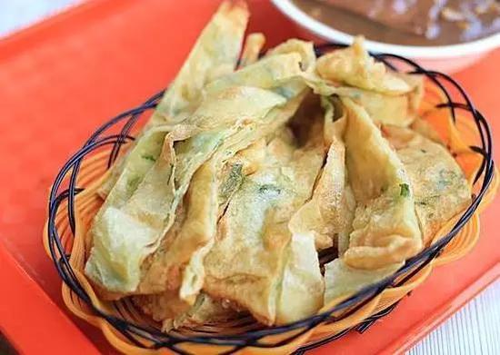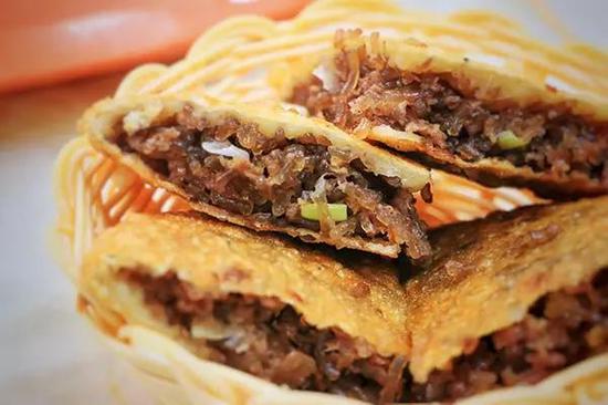 牛肉盒子,一定要現炸的,外面金黃色的薄殼一切開,里面的牛肉粉條就顯露了出來,很夯實。水煎包里面也是粉條居多,素包子個頭兒挺大,里面有雞蛋木耳粉條芝麻葉,內容豐富,皮薄餡兒多解辣不油膩。