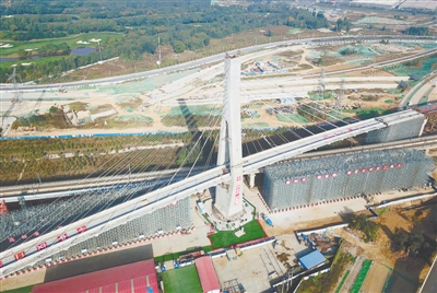 自帶弧度和大陡坡、形似一輪新月和登云天梯的1.65萬噸斜拉橋24日凌晨在鄭州近郊的夜幕中轉體成功,標志著在建的鄭萬鐵路順利跨越徐蘭高鐵,同時也填補了國內小曲線、大縱坡、大偏心轉體斜拉橋施工的空白。