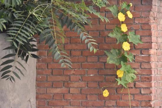 苦瓜花倚在紅磚墻上慵懶地曬著太陽,享受著蜜蜂的簇擁,苦瓜花的花粉是苦是甜,只有蜜蜂知道,也許很甜吧,要不然怎么還會有那么多蜜蜂愿意溺在這一件件黃蓬裙里呢。