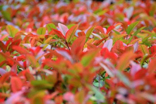 石楠又被人叫做“千年紅”的原因,到了秋天才會明了。接力的紅色隨風染上葉梢,慢慢滲透,將青澀掩藏。石楠葉抖抖殘余的綠,準備好將自己的蛻變展現在人們面前了。