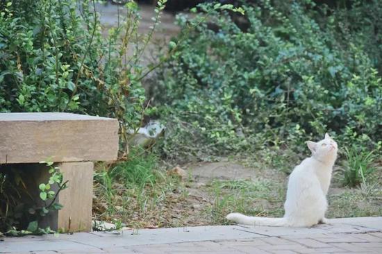 物理南樓附近總有一只白貓徘徊,健康身材,爪子踩在地上很敦實卻又不乏輕俏,白貓喜歡跟著光線走,輕俏的步子踏過草地竟也沒有擾亂了陽光灑下的一池秋夢。