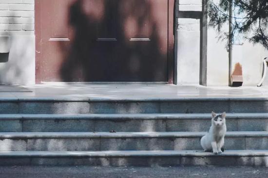 校報室門口的一群喜鵲嘰嘰喳喳,吵醒了后面曬暖的貓,不耐煩地探出頭,嚇走了吵鬧的喜鵲,貓回到校報室門口的臺階上蹲坐,守護著校報室的寧靜。
