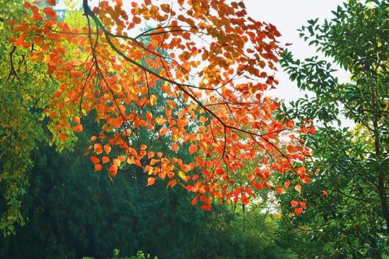 烏桕葉終于能換上好看的紅裙子了,她們將中心花園的秋意點亮。從盛夏到深秋,從翠綠到丹紅,烏桕葉好像也沒有搶了春花和秋楓的風頭,細碎清雅,獨木單株。
