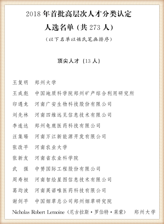 通報中提到,為加快推進國家中心城市建設,按照《中共鄭州市委 鄭州市人民政府關于實施“智匯鄭州”人才工程 加快推進國家中心城市建設的意見》(鄭發〔2017〕23號)和《鄭州市高層次人才分類認定實施細則(暫行)》(鄭政辦〔2017〕112號)規定,經個人申請、單位推薦、主管部門審核、專家評估標準、市政府研究、社會公示等程序,現認定王復明等273人為鄭州市2018年首批高層次人才。