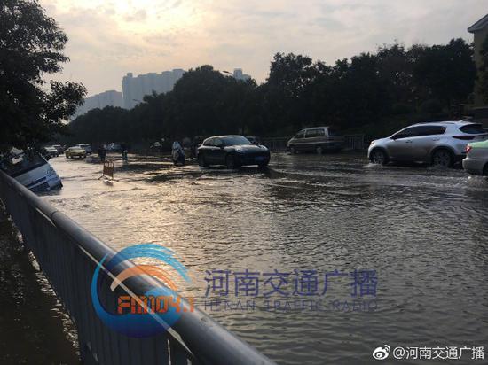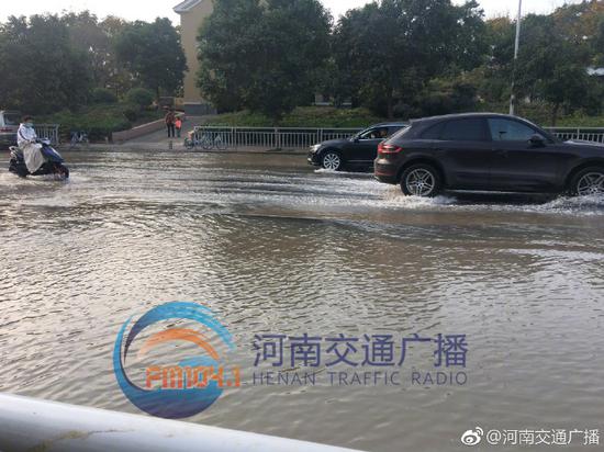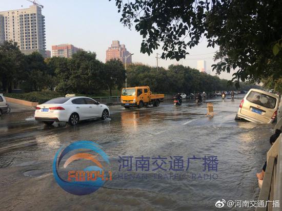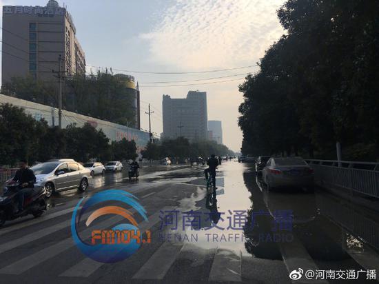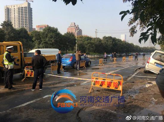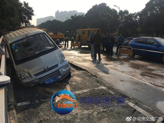 11月4日7點28分左右,鄭州市經三路鑫苑路交叉口向東800米路北,一條直徑400毫米的供水管道爆裂,河南交通廣播記者李芳在現場看到,地下大量涌水造成地面大面積隆起及小面積塌陷,停在路邊的一輛焦作牌照面包車右側車身陷入地面,水量大時,南北半幅車道都被淹沒,車輛通過時速度非常,水流向東一路延伸到了福彩路口,積水還攜帶著黃色泥沙,水落之處非常泥濘,車流量不大,但東向西車輛需要借道對向車道通行。
