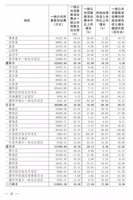 (3)全省普通高中為8149.18元,比上年的6397.76元增長27.38%。增長最快的省轄市是濮陽市(63.39%)。