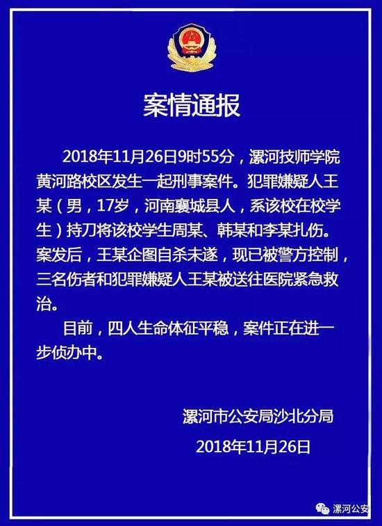 2018年11月26日9時55分,漯河技師學(xué)院黃河路校區(qū)發(fā)生一起刑事案件。犯罪嫌疑人王某(男, 17歲,河南襄城縣人,系該校在校學(xué)生)持刀將該校學(xué)生周某、韓某和李某扎傷。案發(fā)后,王某企圖自殺未遂,現(xiàn)被警方控制,三名傷者和犯罪嫌疑人王某被送往醫(yī)院緊急救治。