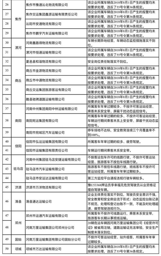 據(jù)介紹,被約談企業(yè)主要存在3個(gè)方面的問(wèn)題。一是企業(yè)主體責(zé)任不落實(shí),安全生產(chǎn)制度不執(zhí)行,安全管理松散,安全教育流于形式。有15家客運(yùn)企業(yè)存在車輛審驗(yàn)過(guò)期、站外經(jīng)營(yíng)、不按許可線路運(yùn)營(yíng)、駕駛員疲勞駕駛等問(wèn)題;有5家旅游客運(yùn)企業(yè)存在管理漏洞,對(duì)車輛管控不嚴(yán),部分車輛長(zhǎng)期異地駐點(diǎn)經(jīng)營(yíng),被外省多次通報(bào);有10家危運(yùn)企業(yè)安全制度不落實(shí),教育培訓(xùn)不到位;50家違法超限超載問(wèn)題嚴(yán)重的貨運(yùn)企業(yè)中,有的車輛違法超載竟達(dá)近60次。