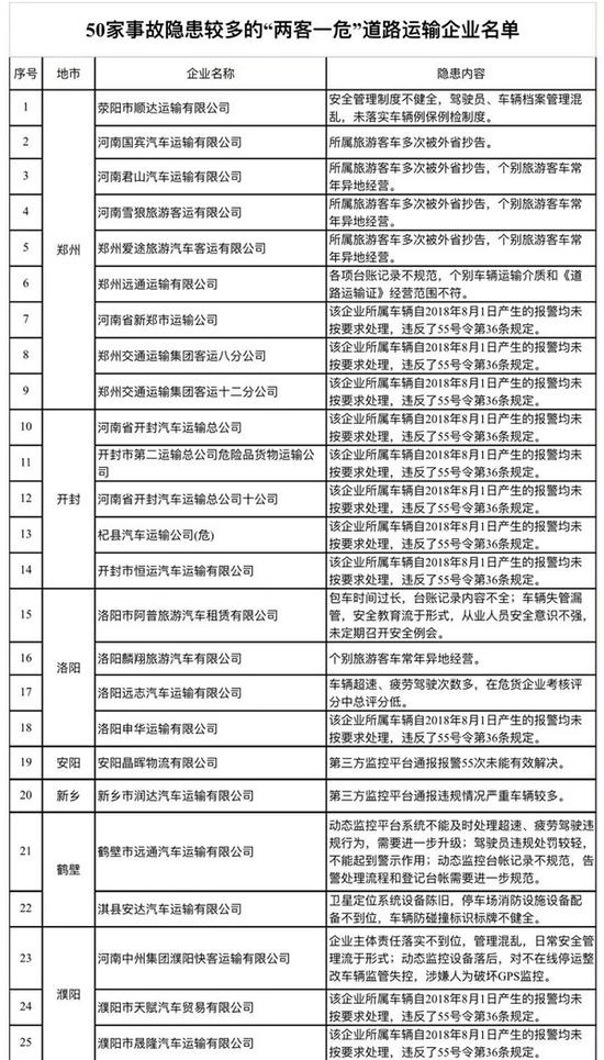 對(duì)通報(bào)的100家企業(yè)隱患問(wèn)題,各相關(guān)地市要照單認(rèn)領(lǐng),建立臺(tái)賬,明確責(zé)任,落實(shí)整改措施,對(duì)違法行為依法處罰,尤其是第二次上榜的13家企業(yè)必須按規(guī)定停業(yè)整頓,相關(guān)管理部門(mén)必須對(duì)其加重處罰。要繼續(xù)開(kāi)展違規(guī)車輛、違章行為、車輛技術(shù)狀況、營(yíng)運(yùn)駕駛員和聯(lián)網(wǎng)聯(lián)控等五項(xiàng)排查,對(duì)排查出的安全隱患,逐條、逐車、逐人、逐企業(yè)制定整改方案,做到整改責(zé)任、措施、資金、時(shí)限、預(yù)案的五落實(shí),確保隱患整改到位,消除存量,遏止增量。抓住重點(diǎn),加大監(jiān)管不丟手,“兩客一?!笔堑缆愤\(yùn)輸安全監(jiān)管重點(diǎn),必須做到重點(diǎn)盯守,嚴(yán)管重罰保安全。
