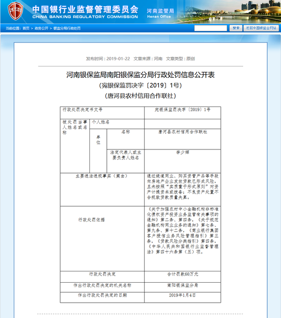 此外,22日還公布了河南銀保監局南陽銀保監分局開出的6張罰單,唐河縣農村信用合作聯社因通過繞道同業、購買資管產品等手段向房地產企業發放貸款已形成風險,且未按照“實質重于形式原則”對資產計提資本或撥備;不良資產處置不合規致貸款質量失真,合計被罰款60萬元,相關負責人李少輝等5人被處罰。