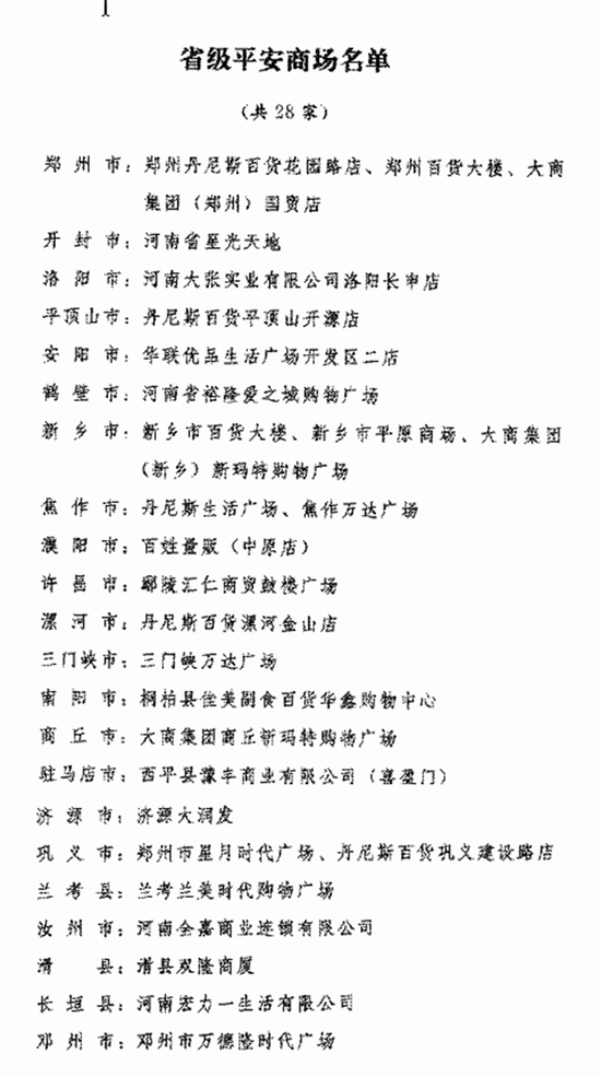 (資料圖片 猛犸新聞·東方今報記者 邱琦 攝)據了解,近年來,全省深入開展“平安商場”創建活動,活動已被納入各地年度綜治和平安建設評價考核體系。此次,鄭州市共有5家商場被命名為“平安商場”,分別是:鄭州丹尼斯百貨花園路店、鄭州百貨大樓、大商集團鄭州國貿店、鄭州市星月時代廣場、丹尼斯百貨鞏義建設路店。此外,河南大張實業有限公司洛陽長申店、丹尼斯百貨平頂山開源店、安陽市華聯優品生活廣場開發區二店、新鄉市百貨大樓、新鄉市平原商場、大商集團新鄉新瑪特購物廣場、焦作萬達廣場等23家商場同時入圍。