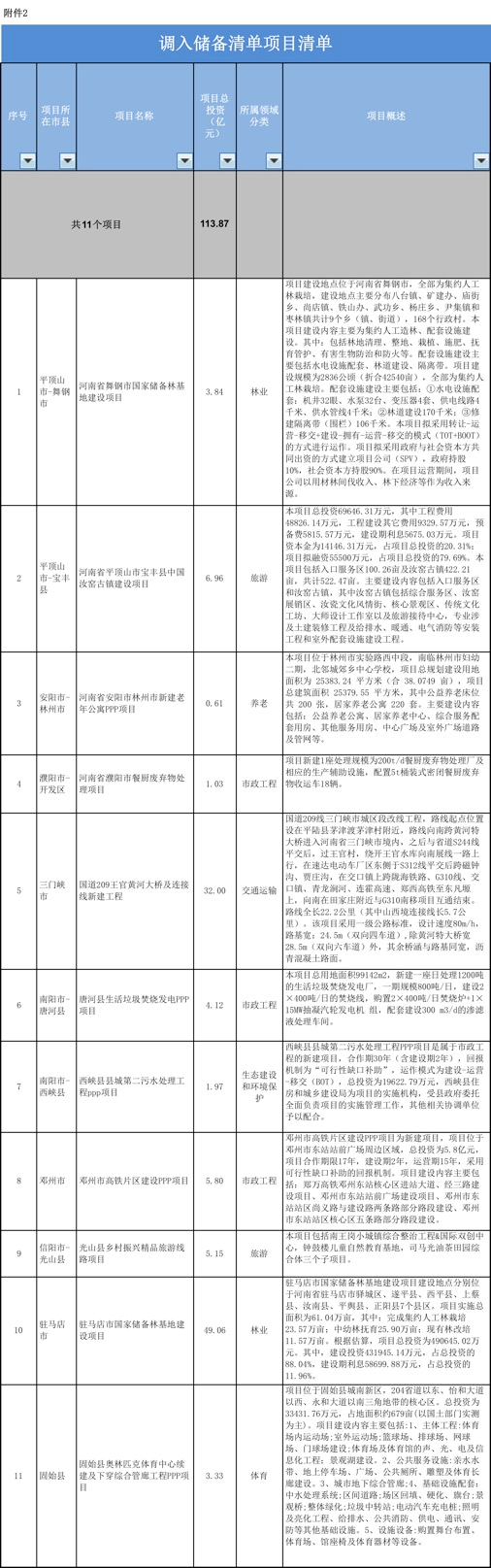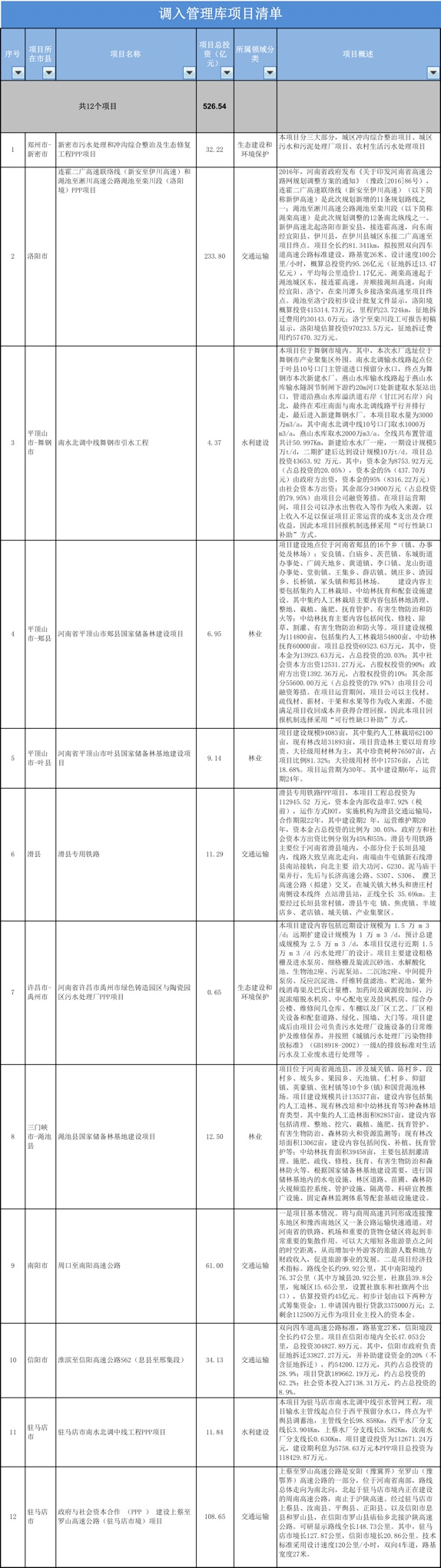 大河財(cái)立方消息,2月3日,根據(jù)《河南省財(cái)政廳PPP項(xiàng)目庫(kù)入庫(kù)指南》調(diào)整項(xiàng)目庫(kù)的工作安排及最新政策動(dòng)向,河南省財(cái)政廳PPP管理中心對(duì)截止1月初市縣申報(bào)進(jìn)入管理庫(kù)及儲(chǔ)備清單的項(xiàng)目進(jìn)行了審查,并將本次調(diào)整結(jié)果予以公告。其中:調(diào)入項(xiàng)目管理庫(kù)項(xiàng)目12個(gè),總投資527億元;調(diào)入項(xiàng)目?jī)?chǔ)備清單項(xiàng)目11個(gè),總投資114億元。詳情如下: