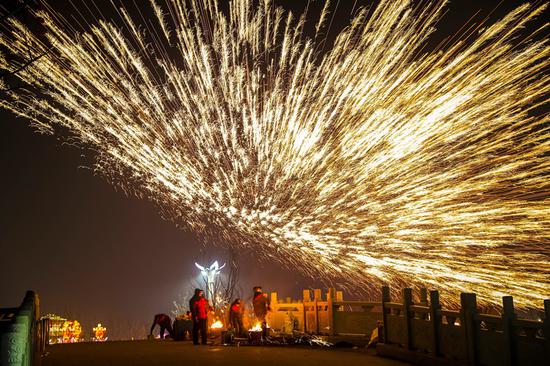 劃旱船、踩高翹、舞長(zhǎng)龍等傳統(tǒng)民俗表演在園區(qū)輪番上演,小丑嘉年華巡游、憨態(tài)可掬的皮卡丘互動(dòng),非常受小朋友們的歡迎,《九州同慶中國(guó)年》、《盛唐歡歌》、《大紅燈籠高高掛》等歌舞演出,經(jīng)典豫劇、漢服茶藝、琵琶彈奏、吉他彈奏、曲藝相聲、川劇變臉等文化演藝都受到廣大游客的熱烈歡迎。最吸引游客的還是國(guó)家非物質(zhì)文化遺產(chǎn)項(xiàng)目“打鐵花”,由熱播劇《延禧攻略》打鐵花團(tuán)隊(duì)親自操作,擊打后的鐵花似雨傾瀉而下,又似繁花朵朵綻放,炫彩奪目。