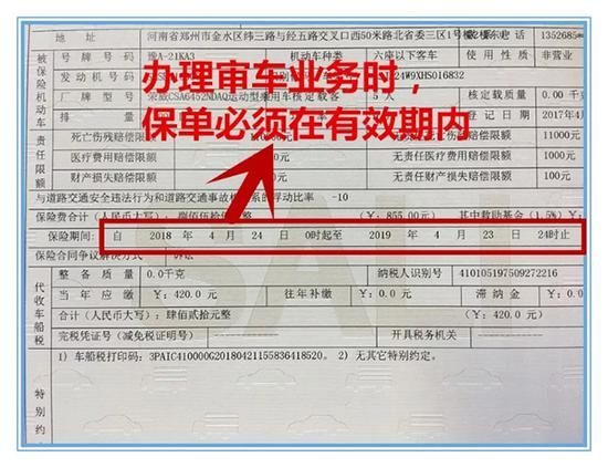 審車時交強險保單需要注意以下這幾處:(1)、保單上車牌號、發動機號和車架號要與行車證上面的完全一致。