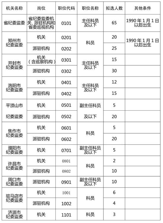 1。河南省紀檢監(jiān)察系統(tǒng)2019年公開選調(diào)工作人員報名職位表