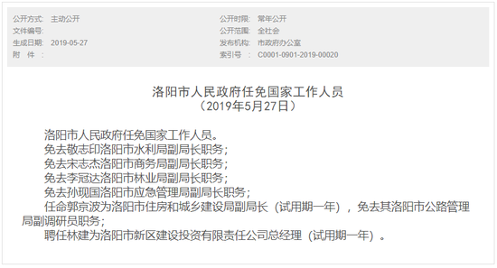 大河財立方消息 5月27日,洛陽市人民政府發(fā)布最新一批人事任免,涉市住房和城鄉(xiāng)建設(shè)局、洛陽市新區(qū)建設(shè)投資有限責(zé)任公司等。