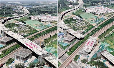 該轉體橋分為東西兩幅分別進行轉體。中鐵七局鄭州公司工程技術中心主任魏奎斐介紹,鐵路西側的轉體橋之前已經完成,29日轉體的是東側橋。此次轉體按照梁端每分鐘0.85米速度進行,這幅橋梁轉體完成后,鐵路兩側橋將實現完美對接。