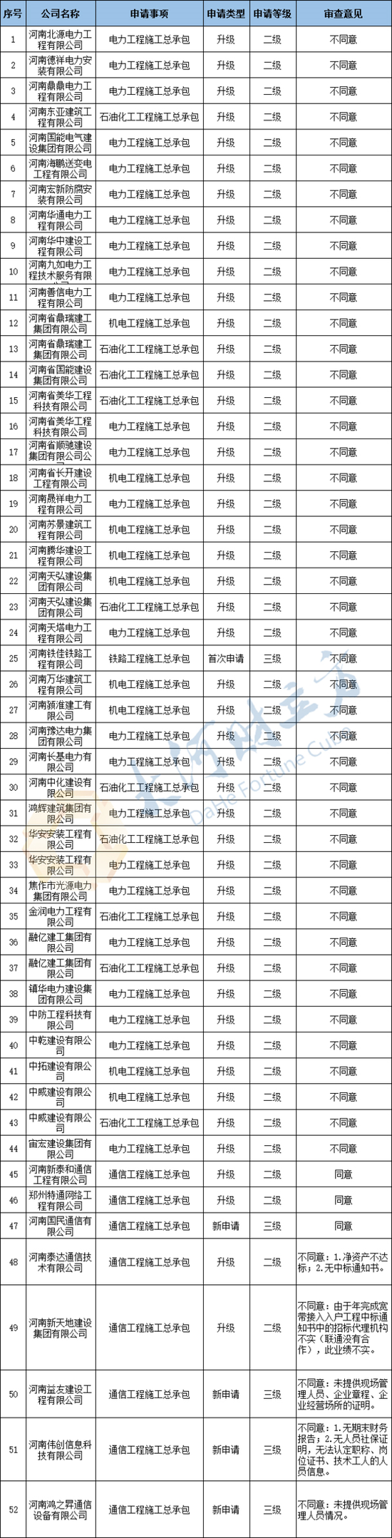 公示結果顯示,僅河南新泰和通信工程有限公司、鄭州特通網絡工程有限公司和河南國民通信有限公司3家企業獲通過,河南北源電力工程有限公司等49家企業獲得不同意的審查意見。