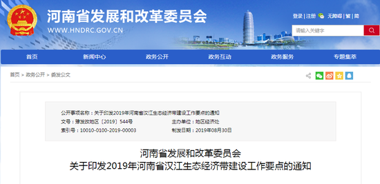 大河財立方消息 日前,河南省發改委網站印發《2019年河南省漢江生態經濟帶建設工作要點》。