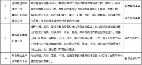 (五)推進能源結構調整。力爭完成豫西南LNG應急儲備中心主體工程,加快推動西氣東輸三線中段、潛江-中原儲氣庫群輸氣管道工程(河南段)等國家油氣干線。加快建設青海至河南±800千伏特高壓直流工程。(責任單位:省發展改革委)