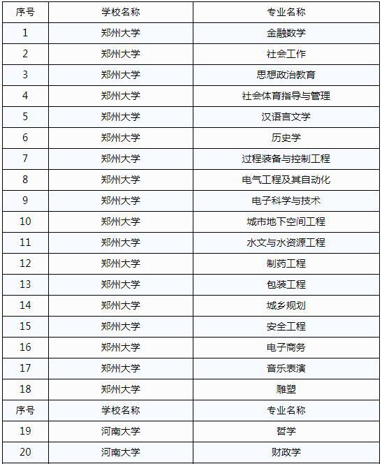 根據(jù)《教育部辦公廳關(guān)于實(shí)施一流本科專業(yè)建設(shè)“雙萬計(jì)劃”的通知》(教高廳函〔2019〕18號)和《河南省教育廳關(guān)于實(shí)施河南省一流本科專業(yè)建設(shè)計(jì)劃的通知》(教高〔2019〕475號)安排,經(jīng)高校申報(bào)、資格審查、會議評審,擬確定鄭州大學(xué)金融數(shù)學(xué)等275個專業(yè)點(diǎn)為2019年度河南省一流本科專業(yè)建設(shè)點(diǎn),現(xiàn)將評審結(jié)果予以公示(見附件)。