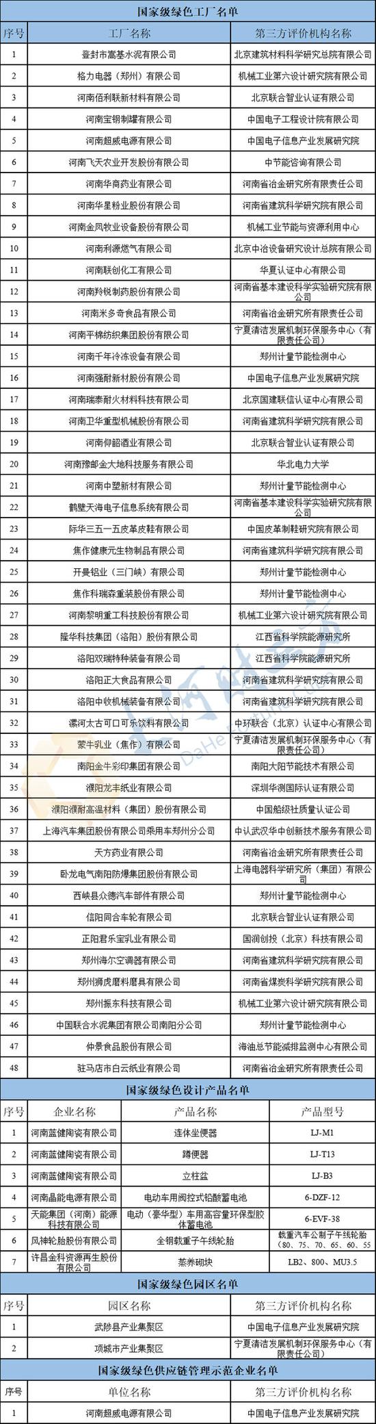通知稱,經申報單位自評價、第三方機構評價、地市工業和信息化主管部門初審推薦以及專家論證、公示等環節,確定了河南省第四批國家級綠色制造名單和2019年省級綠色制造名單。其中國家級綠色工廠48家、綠色設計產品7種、綠色園區2家、綠色供應鏈管理示范企業1家;省級綠色工廠23家、綠色設計產品3種、綠色園區1家、綠色供應鏈管理示范企業2家,省級培育類綠色工廠44家。