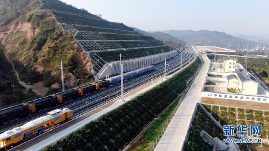 浩吉鐵路全長1813.5公里,北起內蒙古鄂爾多斯市境內的浩勒報吉南站,途經內蒙古、陜西、山西、河南、湖北、湖南、江西7省區,終到京九鐵路吉安站。開通初期開辦車站77座,設計時速120公里,規劃年運輸能力2億噸以上。新華網發 (李嘉南 謝永彬攝)