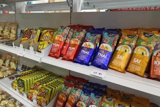 在泰國國家商品館,記者看到各色各樣的泰國特產美食正在陳列貨架上整齊碼著,“AAA級,買五送一”的字樣吸引了市民駐足選購。金色的鳳梨,頂級的榴蓮干,顆粒飽滿的玉米套著真空包裝,色澤十分誘人。泰國館是六個國家館中面積最大的,今年他們組織了15家企業參展,主要銷售咖喱、面食、水果、調料等特色泰國產品。