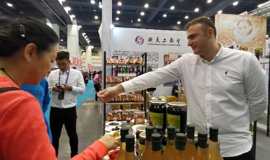 “這是阿爾巴尼亞的酸黃瓜,味道正宗,配面包配菜都好吃。”記者來到歐美工商會展區時,來自阿爾巴尼亞的參展客商阿米爾正操著流利的漢語,熱情推介自己的商品。