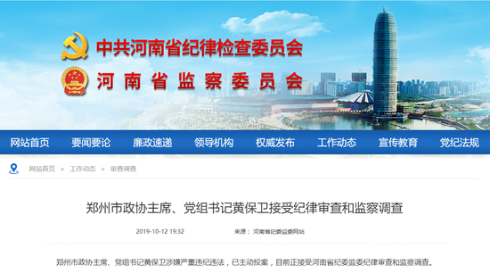 原標題:鄭州市政協主席、黨組書記黃保衛接受紀律審查和監察調查