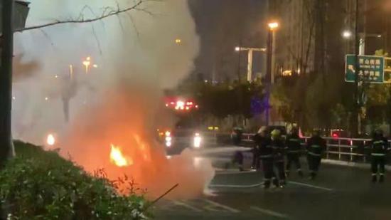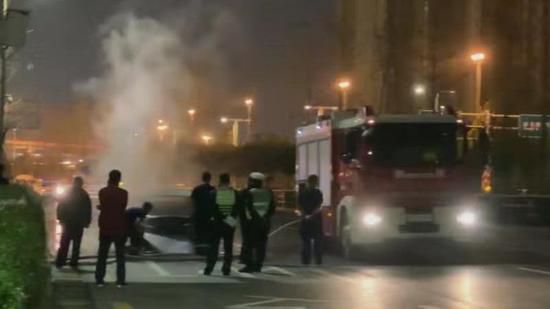 幾分鐘后,民警和消防員很快抵達現場,在疏散附近車輛的同時,迅速將大火撲滅。