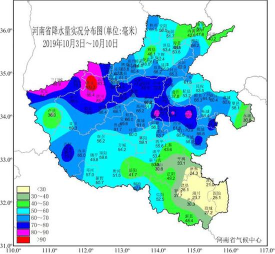 同時,全省平均降水量98.1毫米,較常年同期偏多12%,比去年同期偏多49%。其中豫北和豫西大部偏多五成到1.6倍,而信陽、駐馬店大部偏少五到八成。特別是10月4日后河南降水明顯偏多,全省大部地區偏多2倍以上,沿黃及以北大部偏多5~8倍,封丘、長垣、開封、扶溝4站為建站以來同期最多值。