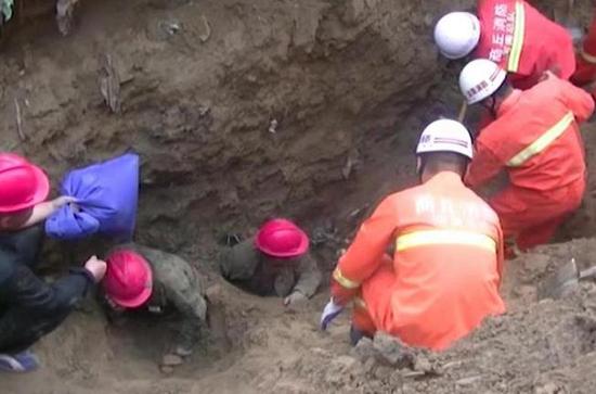 08時39分許,救援人員到達事故現場,經詢問了解得知,3名工人在下水道施工時,東側土方突然松動坍塌,滑落的泥土瞬間將3名工人埋壓。現場情況萬分緊急,由于現場圍觀群眾較多,為防止踩踏導致土方再次坍塌,警戒組協助現場民警進行周圍群眾疏散,同時,救援人員根據現場實際情況立即展開救援,其中,1名施工人員只有腿部被埋壓,救援相對容易,在周圍群眾和救援人員的幫助下很快被救出。但另外2名施工人員胸部以下均已被泥土壓在下方,由于2名被埋人員胸部遭泥土壓迫,為防止長時間壓迫被困人員出現呼吸困難狀況,現場醫護人員第一時間為2名深埋人員進行氧氣輸送,保證2名人員呼吸暢通。由于2名施工人員埋壓位置相鄰,施工溝內作業空間狹小,無法利用大型挖掘設備,救援人員便先從南側位置的用手先將埋在工人周邊的石塊進行清理出來,然后利用鐵鍬等工具對2名工人繼續實施救援。救援過程中,救援人員一邊與施工人員對話進行安撫,防止其昏睡,一邊用用手把胸部和手臂附近的泥土挖開,以緩解其壓力。