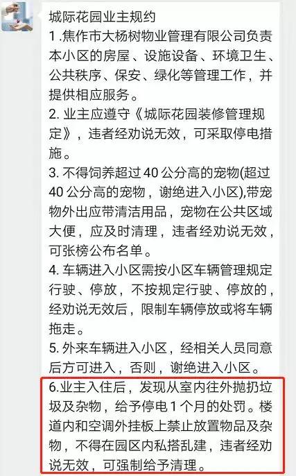 據(jù)該小區(qū)公眾號發(fā)布的業(yè)主規(guī)約內(nèi)容,其中明確:業(yè)主入住后,發(fā)現(xiàn)從室內(nèi)往外拋扔垃圾及雜物,給予停電一個月的處罰。王顯告訴記者:“并不是真停30天,一般7天左右,業(yè)主認識到自己錯誤,寫個書面檢查道歉,就沒事了。”
