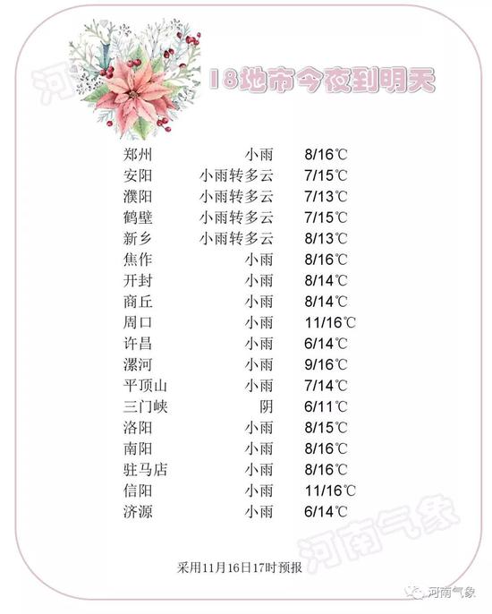 17日白天,全省陰天有小雨,其中駐馬店、信陽(yáng)兩地區(qū)部分地區(qū)有中雨,西部山區(qū)局部有雨夾雪。