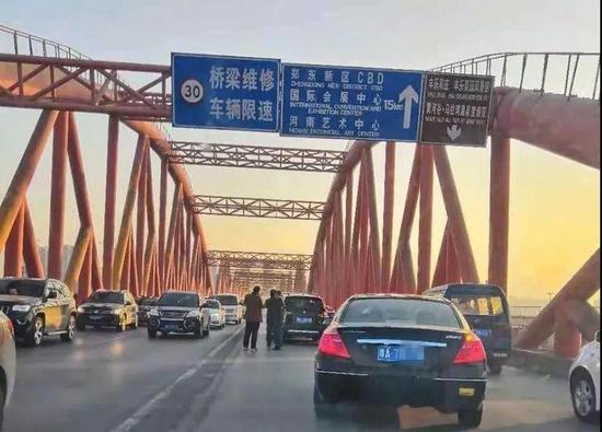 近年來,經(jīng)多次專業(yè)檢測,均顯示全橋剛度和強(qiáng)度不足。按照橋梁安全要求及專家意見,2014年10月對該橋?qū)嵤┝讼薷撸?.5米)、限載和限速等安全措施,并委托河南省交通科研院對橋梁采取了24時實時動態(tài)監(jiān)控。