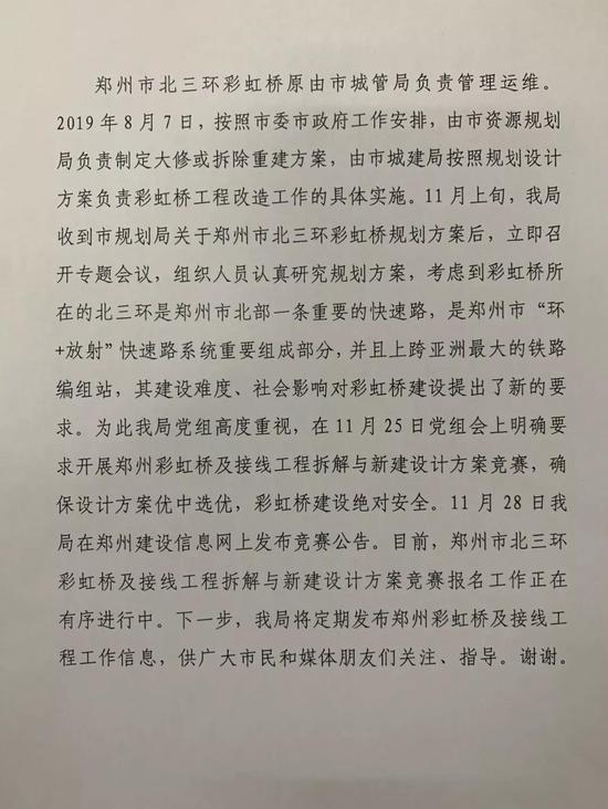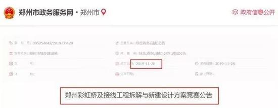 11月28日,來自鄭州市城鄉(xiāng)建設(shè)局的消息給出答案:“彩虹橋”接下來考慮拆解重建,目前正征集拆解和新建設(shè)計方案,方案截止日期為2020年1月2日。